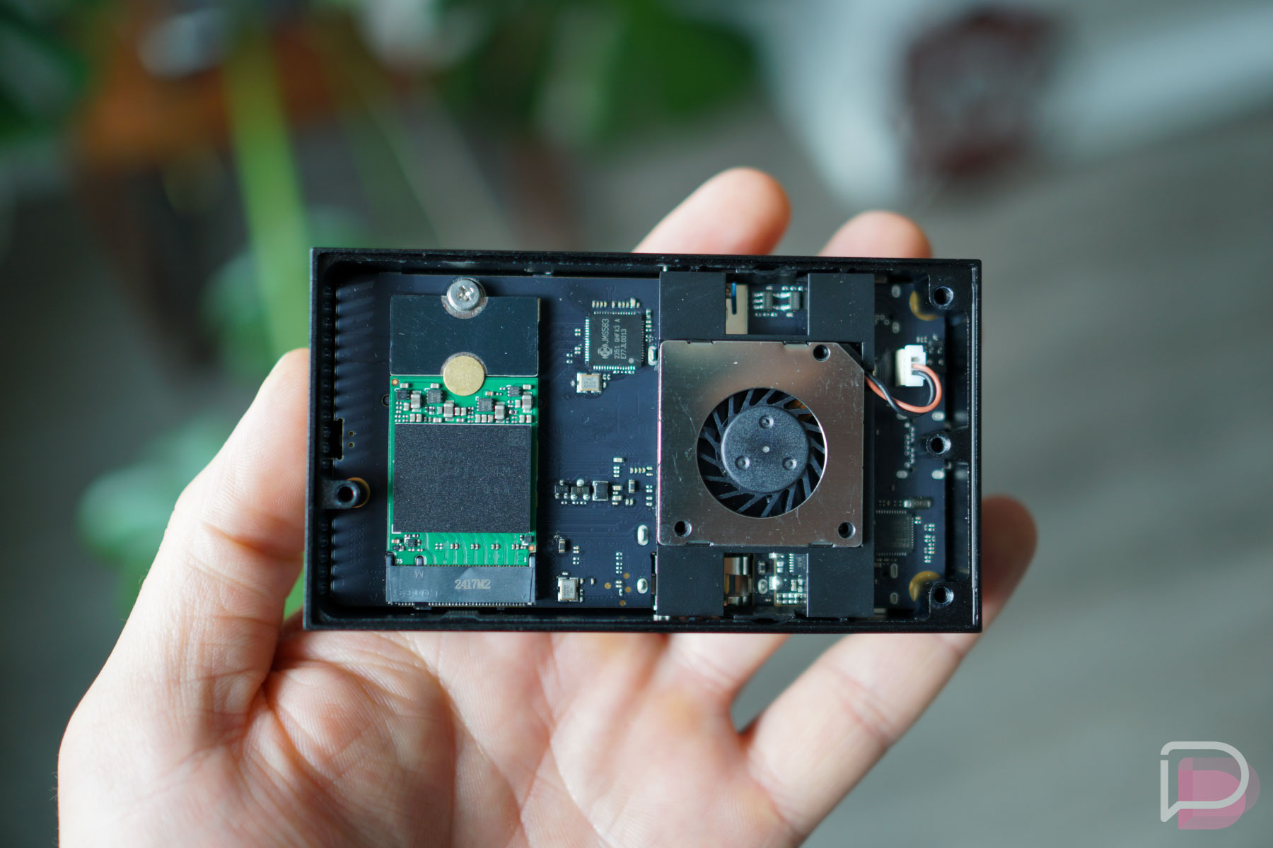 This hub offers a 10Gbps host port for plugging into any supported device (computer, phone, gaming device), support for 2TB M.2 SSD, 100W Power Delivery port for fast charging devices, HDMI port for external displays (4K@120 supported), UHS-II and TF, active cooling system with adjustable fan speed, as well as a USB-A port for my mouse or thumb drive. The touchscreen works relatively well, with a mix of taps and swipes navigating you through the UI. You can rotate the display 180 degrees if needed, but also access software updates and additional settings via the touchscreen. You can also tap on each component to view various information.