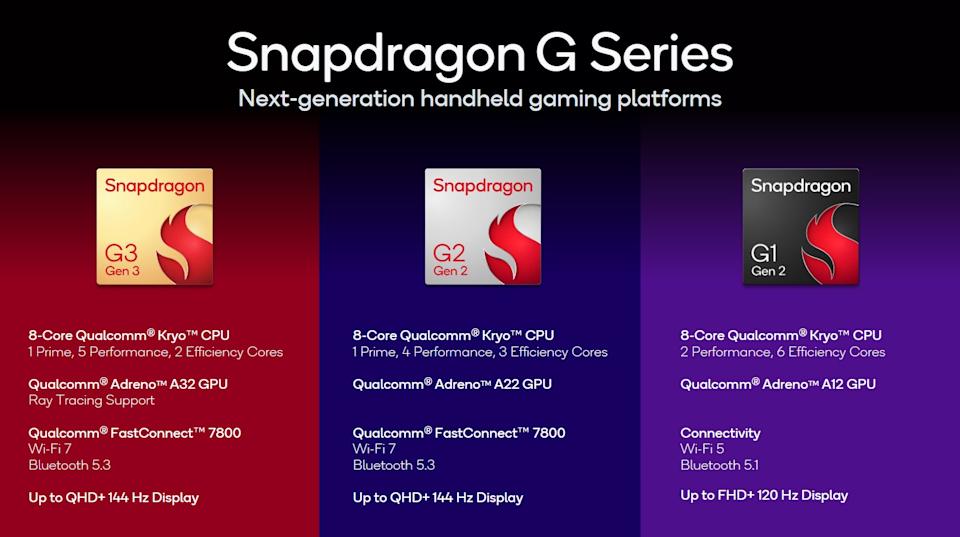 The Snapdragon G3 Gen 3 (the flagship processor) has 30 percent faster CPU performance and 28 percent faster graphics than its Gen 2 predecessor. The new silicon supports up to QHD+ 144Hz displays, Unreal Engine 5's Lumen lighting tech and Wi-Fi 7.