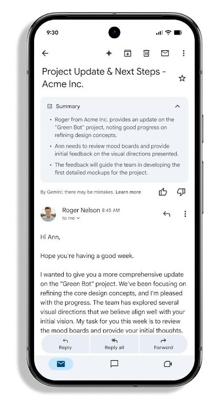 Google says that, “summaries will be available at the top of the email content for messages where a summary is helpful, such as longer email threads or messages with several replies. Gemini will synthesize all the key points from the email thread and any replies thereafter will also be a part of the synopsis, keeping all summaries up to date.”