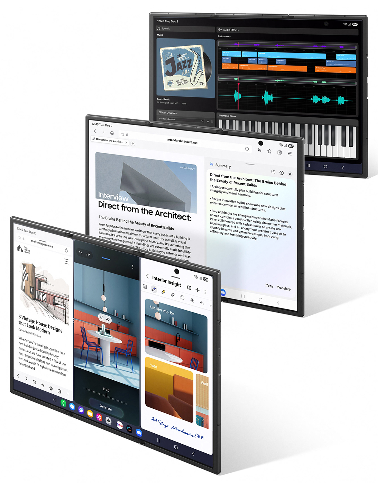 - Samsung’s Most Advanced Hinges Yet: Drawing on its heritage in foldable phone innovation, Samsung refined the Armor FlexHinge to meet the unique demands of Galaxy Z TriFold. Two differently sized hinges with a dual-rail structure work in harmony, creating a smoother, more stable fold despite varying weight and components across the device. The hinge structure also allows the screen panels to meet securely with a minimal gap, enabling the device to be thin and portable.
